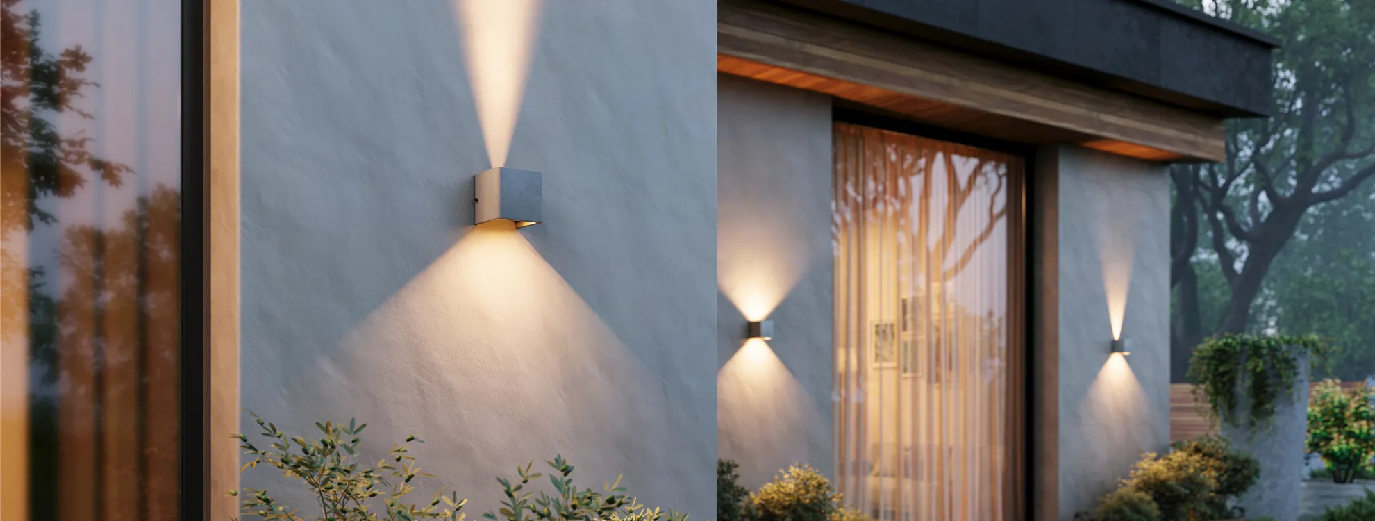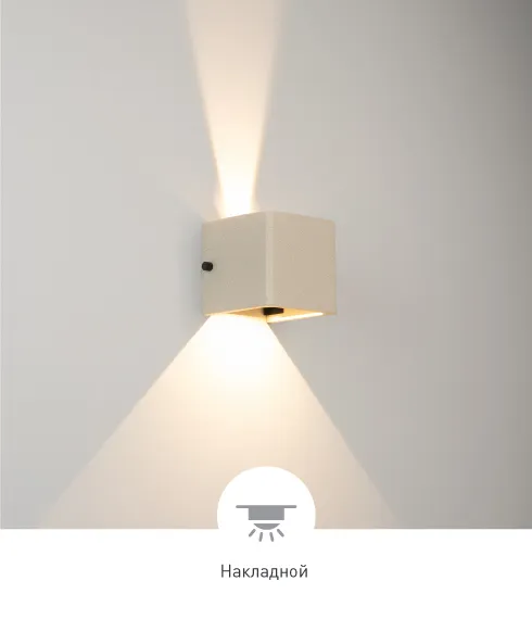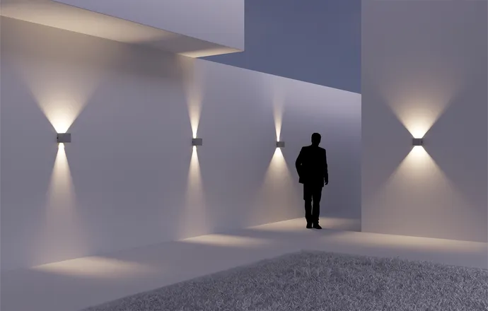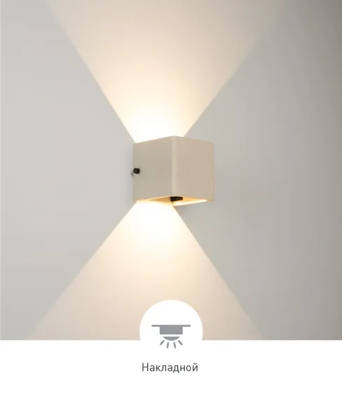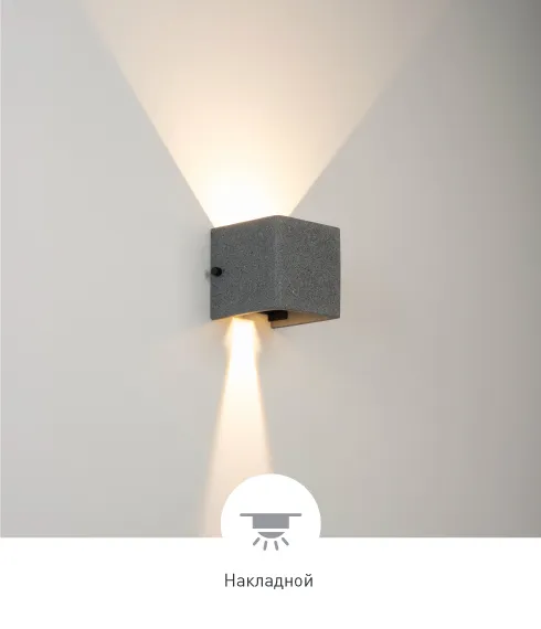 Настенный светильник создает лучи света, направленные вверх и вниз, с теплым цветом свечения (3000 K) и высокой цветопередачей (СRI>90), подчеркивая рельеф поверхности архитектурных сооружений. Кубический корпус выполнен из бетона и гармонично смотрится на фасадах зданий. Угол каждого из лучей регулируется, чтобы формировать выразительные световые акценты на поверхностях стен. Высокая степень защиты IP65 предотвращает попадание влаги и пыли внутрь светильника, что позволяет использовать его под открытым небом.