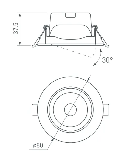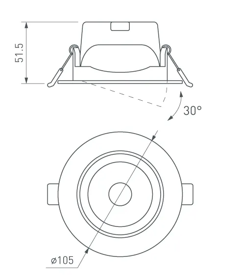 Светильник легко устанавливается с помощью пружин в монтажное отверстие. Световой модуль может отклоняться на 30°, позволяя мгновенно менять направление света.