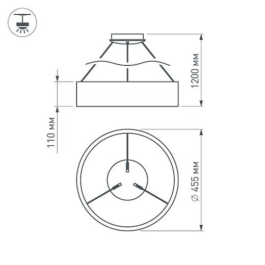Подвесной светильник 33Вт, черный круглый корпус. Цвет ТЕПЛЫЙ БЕЛЫЙ 3000K, св.поток 1900 лм, CRI(Ra)>80, угол 120°. Размер светильника Ф455x110мм. Максимальная длина подвеса 1200мм. Питание AC220-240V, 33Вт, драйвер встроенный (30-42V, 750mA).Пульсация <1%.