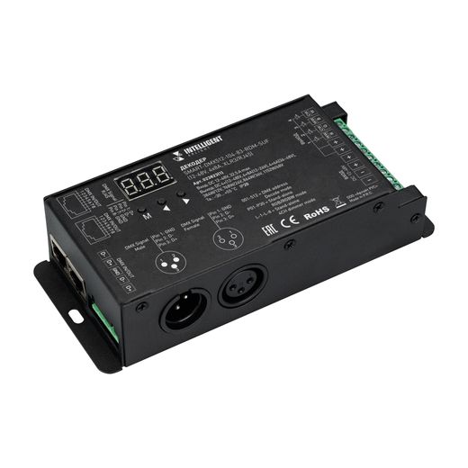 Декодер (преобразователь) цифрового сигнала DMX512 в ШИМ для управления светодиодными лентами. Декодер может регулировать яркость мультицветных лент, осуществлять включение и выключение света, управлять цветом. Декодер совместим с панелями управления с выходом DMX512 и контроллерами DMX512. Также, управление декодером осуществляется кнопками на корпусе, а информация о режиме отображается на цифровом дисплее. Устройство оснащено разъемами RJ-45 и XLR3, обеспечивающими трансляцию сигнала DMX512 на вход и выход. Питание декодера имеет диапазон напряжений от 12В до 48В, максимальный ток 8А на 1 канал при напряжении 12/24VDC; 6A а 1 канал при напряжении 36/48VDC , максимальная мощность 384-1152Вт (в зависимости от напряжения питания), 4 канала управления. Габариты декодера составляют 165x70x38 мм, металлический корпус чёрного цвета.