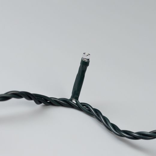 Светодиодная нить Home. Размер 5000 мм. 50 светодиодов размером 5 мм. Основной цвет свечения БЕЛЫЙ (6000 К), эффект мерцания редких точек (БЕЛЫЙ 6000К) с резким световым рисунком (прозрачная вогнутая линза), соотношение светодиодов: 42 белых постоянного свечения / 8 белых с мерцанием. Эффект частого мерцания. Провод темно-зеленый, ПВХ. Питание 230 В, Мощность 3.5 Вт, защита IP20, применение в помещении. Аксессуар для подключения в комплекте.