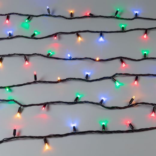 Светодиодная нить Classic. Размер 10000 мм. Цвет свечения RGBY, 100 светодиодов размером 7 мм с динамическими и статическими эффектами свечения с резким световым рисунком (прозрачная вогнутая линза). Смена эффектов и управление осуществляется с помощью контроллера с кнопкой. Провод черный, ПВХ. Питание 230 В, Мощность 7 Вт, защита IP65, применение в помещении и на улице под навесом. Аксессуары для подключения и управления приобретаются отдельно.