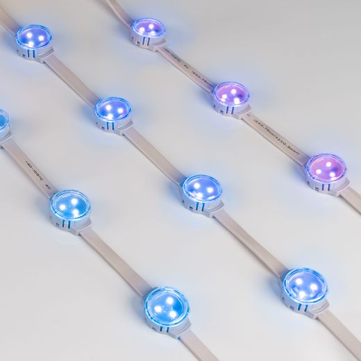 Управляемый светодиодный модуль SPI с держателем, RGB, микросхема RТ16703 (совместимость с контроллерами аналогичной микросхеме 1903), напряжение 12 В, мощность 0.75 Вт, 3 светодиода SMD 3535, угол 120°. Создание медиафасадов. Функция обхода битого пикселя. 30 шт на проводе, расстояние между центрами модулей 105 мм, длина провода между модулями 75 мм. IP67. Размер Ø30×16 мм. Гарантия 3 года.