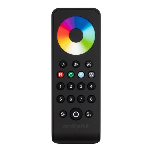 Кнопочный радиочастотный пульт чёрного цвета с сенсорным кольцом, предназначенный для управления мультицветными (RGB/RGBW) источниками света. Поддерживает основные функции: включение и выключение света, регулировку яркости, управление 8 световыми зонами, включение и выключение 2-х пользовательских световых сцен, активация динамических программ. Устройство совместимо с диммерами и контроллерами серии SMART, поддерживающими управление по радиоканалу 2.4G. К одному пульту возможно привязать неограниченное количество диммеров и контроллеров. Питание 3В осуществляется от 2-х батареек ААА. Корпус пульта выполнен из пластика с покрытием Soft-Touch. Габариты устройства 141x51x17.5 мм.