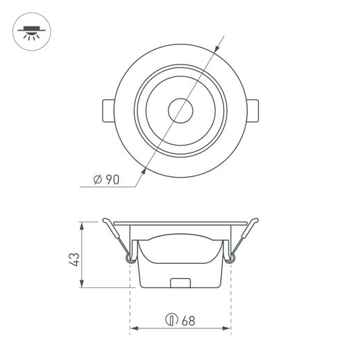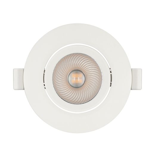 Встраиваемый поворотный светильник "даунлайт". Мощность 6.5 Вт, св. поток 550 лм, 85 лм/Вт, дневной 4000 K, CRI>80, UGR<19, угол 36°, напряжение питания 230 В. Белый круглый корпус из теплопроводящего полиамида, степень защиты IP20, угол поворота оси 30°. Размер: диаметр 90 мм, высота 43 мм. Монтаж встраиваемый, установочное отверстие диаметр 68-80 мм. Пульсация <2%.