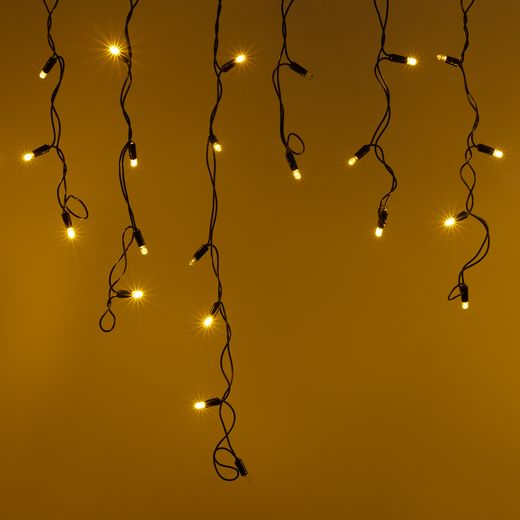 Светодиодная бахрома Classic. Размер 2400 мм (длина 2400 мм, по длине 24 нити высотой 200/600 мм). Количество светодиодов 88 шт размером 7 мм. Цвет свечения ТЕПЛЫЙ БЕЛЫЙ (3000 К). Эффект медленного мерцания каждого светодиода с резким световым рисунком (прозрачная вогнутая линза). Провод черный, ПВХ. Питание 230 В, Мощность 6 Вт, защита IP65, применение на улице под навесом. Аксессуары для подключения приобретаются отдельно.