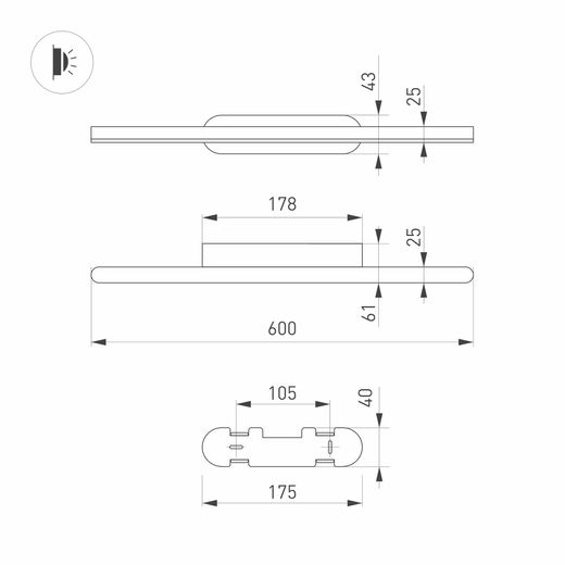Декоративный настенный светильник. Мощность13 Вт, св. поток 630 лм, 52 лм/Вт, дневной 4000 K, CRI>90, угол 120°, напряжение питания 230 В. Белый фигурный корпус из алюминия, экран из матового поликарбоната, степень защиты IP54. Размер: длина 600 мм, ширина 60 мм, высота 42 мм. Размер светоизлучающего модуля: длина 600 мм, ширина 25 мм, высота 25 мм Монтаж накладной. Пульсация <0,5.