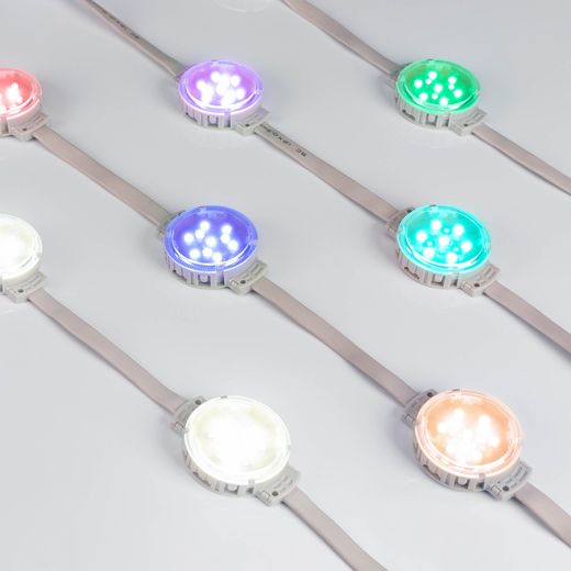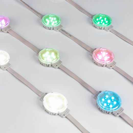 Управляемый светодиодный модуль DMX, RGBW, микросхема UCS512C3, напряжение 24 В, мощность 2 Вт, 10 светодиодов RGB SMD 3535, 3 светодиода White 6000K SMD 3535, угол 120°. Создание медиафасадов, 30 шт на проводе, расстояние между центрами модулей 170 мм, длина провода между модулями 105 мм. Степень пылевлагозащиты IP68. Размер Ø50×66×15 мм. Гарантия 3 года.