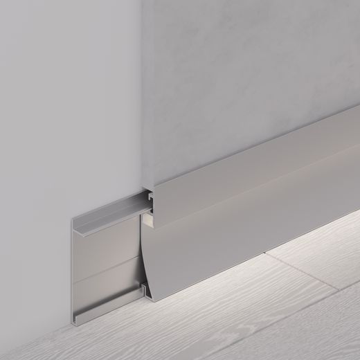 Встраиваемый двухкомпонентный профиль-плинтус из анодированного алюминия с накладным фланцем для создания эффекта парящей стены.