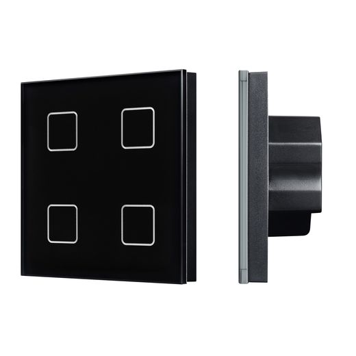 Встраиваемая стеклянная сенсорная панель DALI. Цвет - чёрный. 4 кнопки, управление 4 адресами DALI. Каждой кнопкой выполняется включение, выключение и диммирование по соответствующему ей адресу. Установка стартового адреса управления выполняется переключателями на корпусе. Питание 24VDC, либо по шине DALI. Подсветка кнопок, датчик приближения, звуковой сигнал срабатывания. Габариты 86x86x34.5 мм.