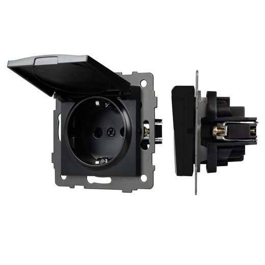 Механизм розетки с заземлением на 1 пост с влагозащитной крышкой. Цвет - черный. Без фронтальной рамки. Уровень пылевлагозащиты IP44. Устанавливается в стандартный подрозетник. Габаритные размеры: длина 71 мм, ширина 71 мм, высота 52 мм. Гарантийный срок 10 лет.