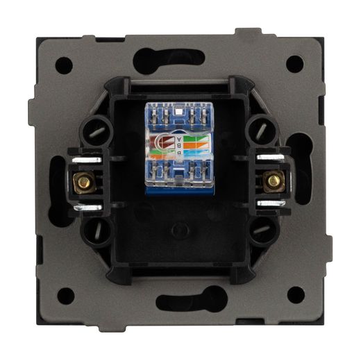 Механизм компьютерной розетки совместим с рамками серии TENDO, создает утонченный минималистичный вид. Скрытый тип монтажа позволяет гармонично встроить в интерьер любого современного дизайн-проекта. Видимая часть механизма выполнена из высококачественного пластика матового графитового цвета и имеет Soft-Touch покрытие, что придает изделию приятные тактильные ощущения и стильный внешний вид. Выходной порт RJ-45 (Female) формата 8P8C соответствует категории 6 (Cat.6), что поддерживает высокоскоростные соединения до 10 Гбит/с на расстоянии до 55 метров. Откидная крышка защищает выходной порт от повреждения и загрязнения внешних контактов разъема. Контактная часть выполнена по технологии IPC (изоляционно–пробивающего контакта) с нанесением цветной маркировки схемы разводки на корпус, позволяя быстро и легко подсоединить механизм компьютерной розетки к большинству многожильных кабелей типа UTP (неэкранированные). Металлический суппорт окрашен порошковой краской в несколько слоев и выполнен из металла толщиной 1,5мм, что обеспечивает безопасность и уверенность в установке. А усиленные распорные (монтажные) лапки надежно фиксируют механизм в стандартном установочном подрозетнике. На каждой стороне суппорта размещены фиксирующие элементы, позволяющие комбинировать механизмы в системы до 5шт горизонтально, под соответствующую рамку.