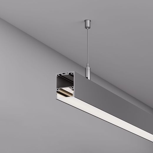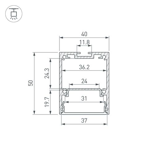 Накладной/подвесной профиль из анодированного алюминия серебристого цвета для основного освещения с возможностью герметизации до IP54 с помощью аксессуаров к профилю (уплотнительная резинка, заглушки, экраны, муфты) без дополнительного использования силиконового герметика, до IP65 с помощью аксессуаров к профилю (уплотнительная резинка, заглушки, экраны, муфты) при условии дополнительного использования силиконового герметика. Габаритные размеры профиля составляют 2000 мм в длину, 40 мм в ширину и 50 мм в высоту. Площадка для установки светодиодных лент позволяет использовать ленту шириной до 24 мм и мощностью до 36 Вт/м.