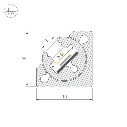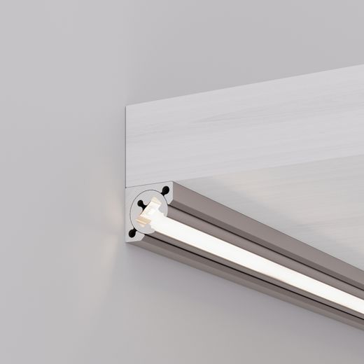 Накладной профиль матового золотого цвета из алюминия в комплекте с матовым экраном из акрила со светопропусканием 68% для подсветки мебели, пазов, ниш и других элементов интерьера. Габаритные размеры профиля составляют 2000 мм в длину, 10 мм в ширину и 10 мм в высоту. Площадка для установки светодиодных лент позволяет использовать ленту шириной до 5.6 мм и мощностью до 10 Вт/м. Профиль имеет поворотный механизм, который позволяет регулировать наклон подсветки.