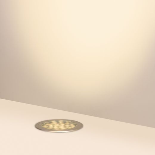 Поставка под заказ от 52 шт. Встраиваемый светодиодный светильник для грунта и пола. Мощность 48Вт, световой поток 3250 лм, цвет теплый 3000К. CRI(Ra)>80, угол 10°. Круглый влагозащищенный корпус IP67, нержавеющая сталь. Экран закалённое стекло. Питание 230В, 48Вт. Размер DxH Ø260x150мм. Установка в отверстие DxH Ø239x144мм.