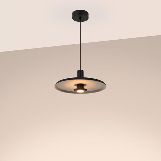 Подвесной светильник. Мощность 12 Вт, св. поток 597 лм, 49 лм/Вт, теплый 2700 K, CRI>94, угол 36°, напряжение питания 230 В. Темно-серый фигурный корпус из переработанного фетра с светло-серой внутренней поверхностью, линза-рассеиватель из PMMA, степень защиты IP20. Размер: диаметр 350 мм, высота 145 мм. Монтаж подвесной, длина подвеса 2000 мм, регулируемая. В комплекте 2 вида чаш. Габариты чаши (встраиваемая) Ø80 х 23 мм, врезное отверстие Ø60 мм. Габариты чаши (накладная) Ø120 x 35 мм. Драйвер 59 В, 300 мА, пульсация <1%. Управление по TRIAC.