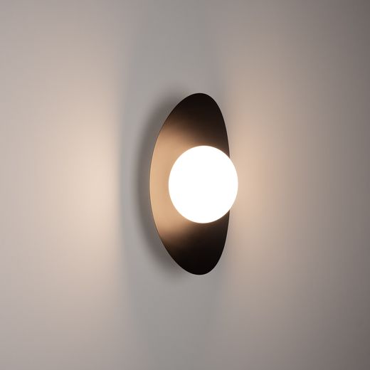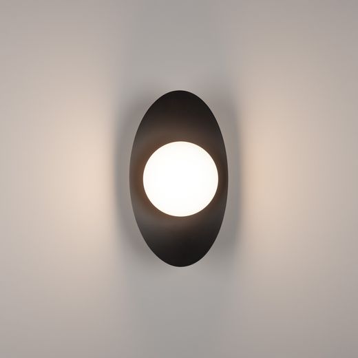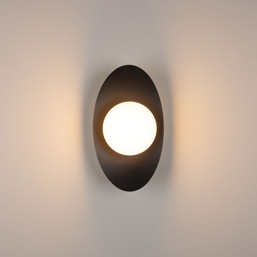 Декоративный настенный светильник. Мощность 6 Вт, св. поток 325-340 лм, 50-52 лм/Вт, теплый 2700 K,теплый 3200К, дневной 4000 K (переключаются), CRI>92, угол 150°, напряжение питания 230 В. Фигурный корпус из металла, цвет: черный, экран из матового стекла, степень защиты IP20. Размер: габариты световой части: Ø145x70 мм, габариты чаши: Ø110 x 42 мм. Монтаж накладной. Встроенный блок питания: 12В DC, 0,75А, пульсация <2%. Встроенный диммер TOUCH-DIM.