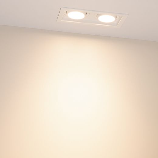 Встраиваемый карданный светильник. Мощность 2х12 Вт, св. поток 2788 лм, 116 лм/Вт, тёплый 3000 K, CRI>92, угол 40°, напряжение питания 230 В. Белый корпус из алюминия, белая вставка, степень защиты IP20. Размер: длина 170 мм, ширина 90 мм, высота 80 мм. Монтаж встраиваемый, установочное отверстие: длина 155 мм, ширина 75 мм. Драйвер 27-40 В, 300 мА, пульсация <2%.