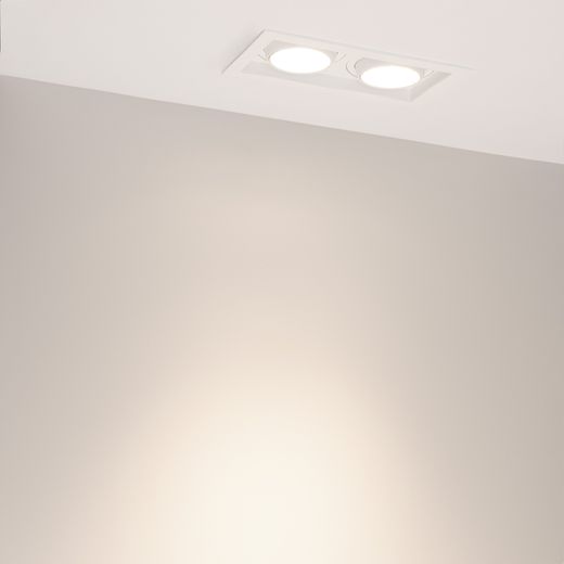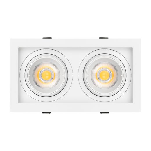 Встраиваемый карданный светильник. Мощность 2х20 Вт, св. поток 4264 лм, 106 лм/Вт, дневной 4000 K, CRI>92, угол 40°, напряжение питания 230 В. Белый корпус из алюминия, черная вставка, степень защиты IP20. Размер: длина 210 мм, ширина 117 мм, высота 105 мм. Монтаж встраиваемый, установочное отверстие: длина 190 мм, ширина 95 мм. Драйвер 24-42 В, 500 мА, пульсация <2%.