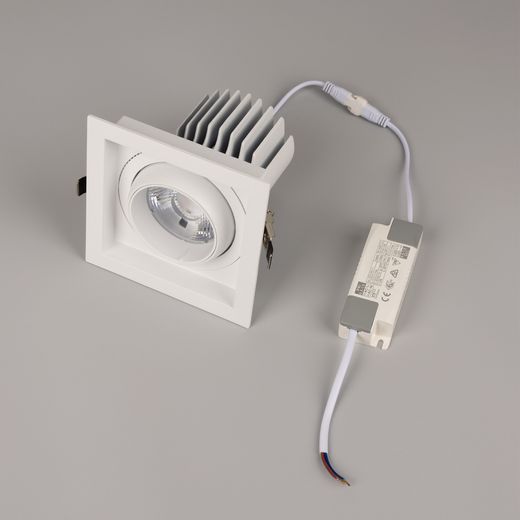 Встраиваемый карданный светильник. Мощность 30 Вт, св. поток 3104 лм, 102лм/Вт, дневной 4000 K, CRI>92, угол 17°, напряжение питания 230 В. Белый корпус из алюминия, белая вставка, степень защиты IP20. Размер: длина 140 мм, ширина 140 мм, высота 125 мм. Монтаж встраиваемый, установочное отверстие: длина 120 мм, ширина 120 мм. Драйвер 24-42 В, 750 мА, пульсация <2%.