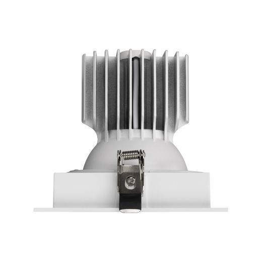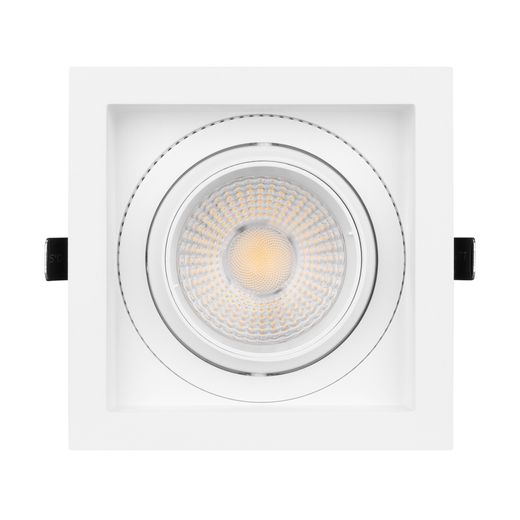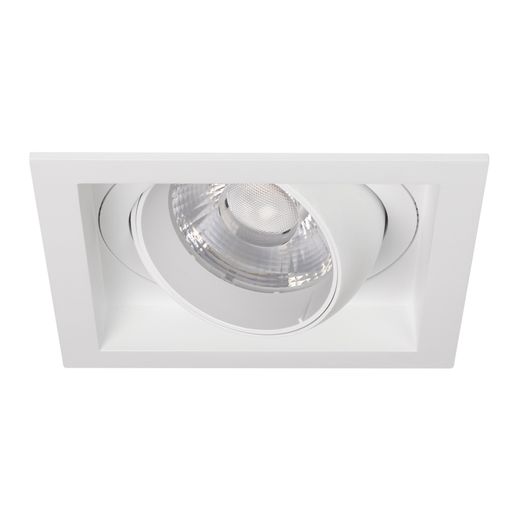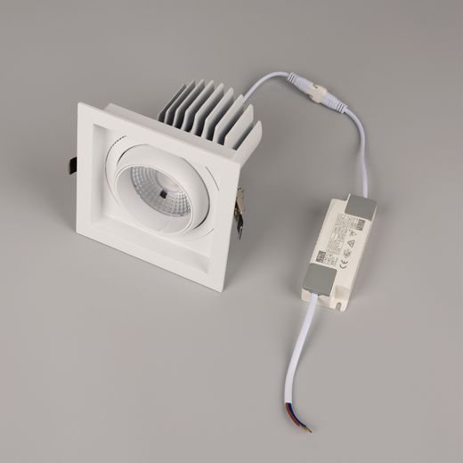 Встраиваемый карданный светильник. Мощность 30 Вт, св. поток 2650 лм, 88 лм/Вт, тёплый 3000 K, CRI>92, угол 50°, напряжение питания 230 В. Белый корпус из алюминия, белая вставка, степень защиты IP20. Размер: длина 140 мм, ширина 140 мм, высота 125 мм. Монтаж встраиваемый, установочное отверстие: длина 120 мм, ширина 120 мм. Драйвер 24-42 В, 750 мА, пульсация <2%.