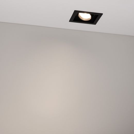 Встраиваемый карданный светильник. Мощность 12 Вт, св. поток 1394 лм, 116 лм/Вт, дневной 4000 K, CRI>92, угол 40°, напряжение питания 230 В. Чёрный корпус из алюминия, чёрная вставка, степень защиты IP20. Размер: длина 90 мм, ширина 90 мм, высота 80 мм. Монтаж встраиваемый, установочное отверстие: длина 75 мм, ширина 75 мм. Драйвер 27-40 В, 300 мА, пульсация <2%.
