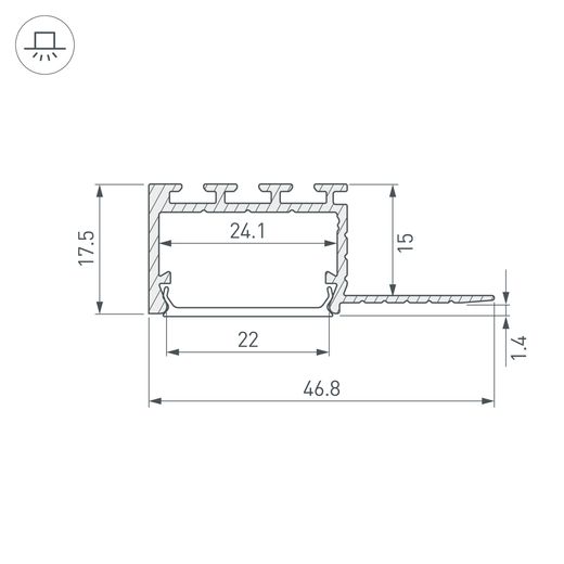 Габаритные размеры профиля составляют 2000 мм в длину, 46,8 мм в ширину и 17,5 мм в высоту. Площадка для установки светодиодных лент позволяет использовать ленту шириной до 24 мм и мощностью до 37 Вт/м. Это обеспечивает гибкость в выборе светодиодных лент и создает потрясающие световые решения.