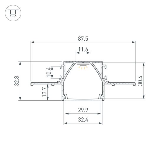 Встраиваемый профиль из анодированного алюминия со скрытым фланцем для установки в гипсокартон толщиной 12,5 мм для основной и контурной подсветки помещений. Габаритные размеры профиля составляют 2000 мм в длину, 87,5 мм в ширину и 32,8 мм в высоту. Площадка для установки светодиодных лент позволяет использовать ленту шириной до 11 мм и мощностью до 35,7 Вт/м. Это обеспечивает гибкость в выборе светодиодных лент и создает потрясающие световые решения.