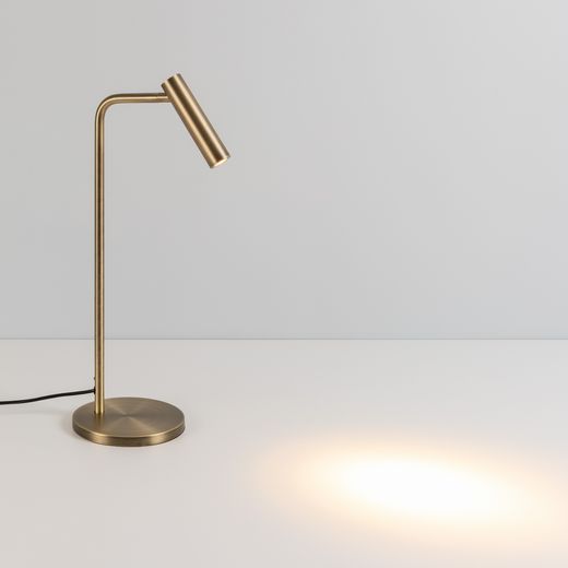 Декоративный настольный светильник. Мощность 3 Вт, св. поток 180 лм, 60 лм/Вт, теплый 3000К, CRI>90, угол 20°, напряжение питания 230 В. Бронзовый корпус из алюминия (основание, ножка, светоизлучаль в форме спота), степень защиты IP20. Размер основания Ø140×11 мм, размер ножки Ø12.7×400х105 мм, размер светоизлучателя Ø28×120 мм. Длина провода 1510 мм, питание от сети 220-240V., пульсация <2%.