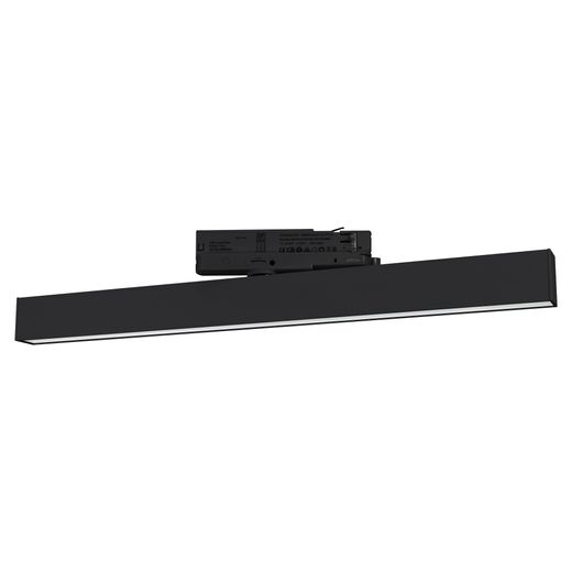 Светильник для треков/шин 4 провода с управлением DALI. Мощность 25 Вт, св. поток 2078 лм, 83 лм/Вт, дневной 4000 K, CRI>90, угол 100°, напряжение питания 230 В. Черный корпус из алюминия, материал рассеивателя PC, степень защиты IP20. Размер: длина 605 мм, ширина 34 мм, высота 50 мм. Драйвер 10-42В (300-800 мА), 50/60Гц, максимальная мощность 42W. Монтаж на трек 3-фазный.