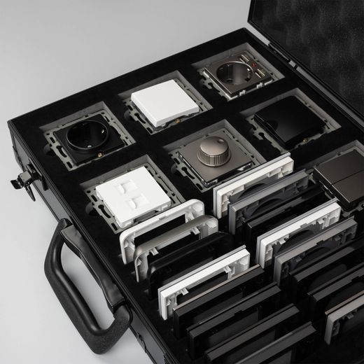Демо-кейс с наполнением электроустановочных изделий серий VERSA, GLARE, PRESTO и сопутствующих механизмов. Демо-кейс содержит: Рамки серии VERSA в цветах белый, черный и серебристый (серый); Рамки серии GLARE в цветах белый, черный и серебристый (серый), в двух вариациях: со стандартным вырезом (квадрат) и с круглым вырезом (совместимые с механизмами арт. 043740/043739/043741); Рамки серии PRESTO в цветах черный и серебристый (серый), в двух вариациях: со стандартным вырезом (квадрат) и с круглым вырезом (совместимые с механизмами арт. 043740/043739/043741); Механизм выключателя на две клавиши (проходной) в серебристом (сером) цвете - арт. 043729 Механизм компьютерной розетки (двойной) в белом цвете - арт. 045336 Механизм розетки с дополнительными USB Type A выходами в серебристом (сером) цвете - арт. 043735 Механизм розетки под евровилку в черном цвете - арт. 043740. Механизм розетки влагозащищенный в черном цвете - арт. 043746 Механизм светорегулятора в золотом цвете - арт. 045795 Механизм выключатель на одну клавишу (перекрёстный) в белом цвете - арт. 043718 Заглушка для розетки в белом цвете - арт. 044892 Рамки представленных серий накладного типа монтажа - не требуют дополнительного оборудования для установки рамки на механизме.