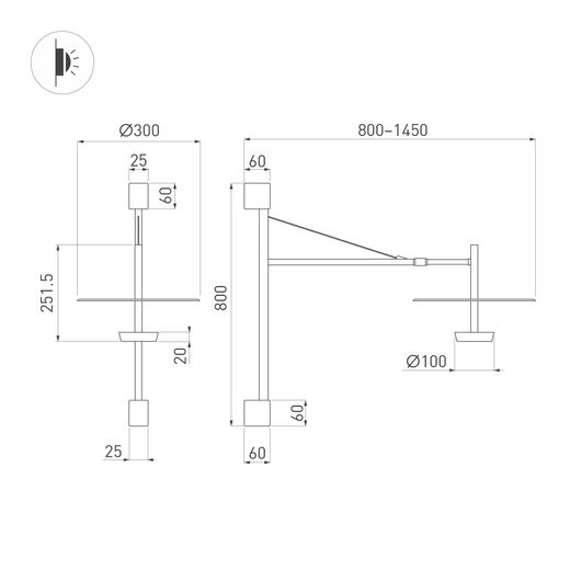 Настенный светильник. Мощность 9 Вт, св. поток 310 лм, 34 лм/Вт, теплый 3000К, CRI>94, угол 130°, напряжение питания 230 В. Черный корпус из алюминия, степень защиты IP20. Размер: диаметр плафона 300 мм, высота плафона 251 мм. Монтаж настенный, регулируемая телескопическая штанга 800-1450мм. Драйвер 23-40 В, 300 мА, пульсация <1%.