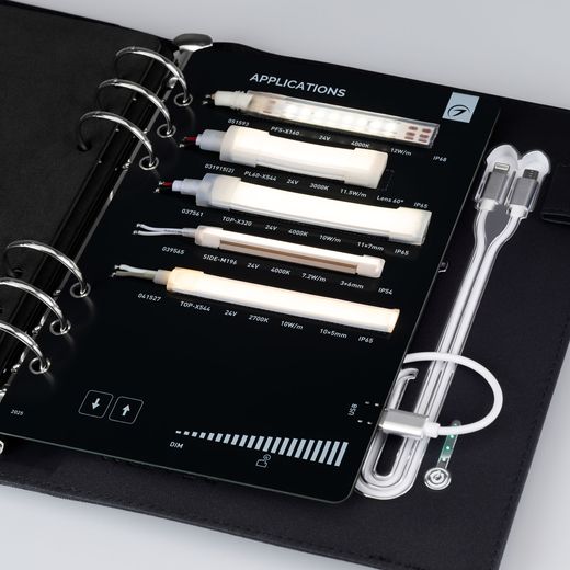 В кейс входят 17 образцов моделей лент COB, RTW, MICROLED, MIX, MOONLIGHT.