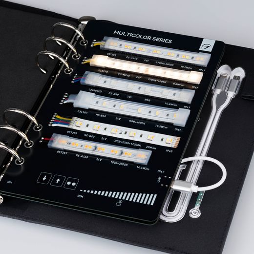 В кейс входят 17 образцов моделей лент COB, RTW, MICROLED, MIX, RGB, (RGBW, RGB-White MIX), NEON (MOONLIGHT).