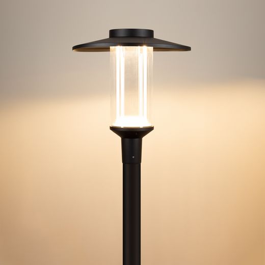 Поставка под заказ от 5 шт. Венчающий светодиодный светильник. Мощность 50 Вт, св. поток 6330 лм, 129 лм/Вт, тёплый 2700 K, CRI>80, угол 150х30°, напряжение питания 230 В. Черный корпус из алюминия, экран закаленное стекло, степень защиты IP65. Размер: диаметр 550 мм, высота 640 мм. Монтаж на вертикальную опору диаметром 76 мм.
