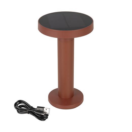 Настольный светильник со встроенным аккумулятором мощностью 1.4Вт, алюминиевый корпус, цвет кортен. Цвет теплый белый 2700K, св.поток 102 лм, CRI(Ra)>85, угол 105°. Размер Ø130x217, размер основания Ø92x18. IP54. Зарядка через кабель USB. Тип встроенного аккумулятора 2000мАч. Солнечная батарея 1.25Вт.