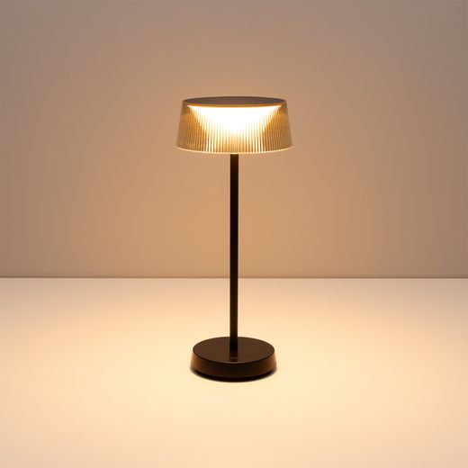 Настольный светильник со встроенным аккумулятором мощностью 1.5Вт, черный алюминиевый корпус. Цвет теплый белый 2700К, св.поток 83 лм, CRI(Ra)>86, угол 125°. Размер Ø154x360мм, размер основания Ø118x26. IP54. Тип встроенного аккумулятора 2000мАч Li-ion, напряжение батареи DC3.7V.