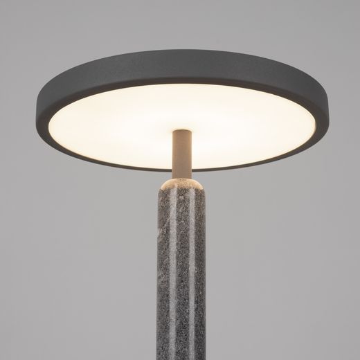 Настольный светильник ALYSS. С изменяемой цветовой температурой 2700/3200/4000К, переключается коротким нажатием на сенсорную кнопку на плафоне, диммирование происходит за счет ее удержания. Мощность 5 Вт, св. поток 195 лм, 39 лм/Вт, CRI>92, угол 110°, напряжение питания 230 В. Темно-серый корпус из алюминия, декоративная вставка из мрамора, степень защиты IP20. Размер: диаметр 225 мм, высота 300 мм. Пульсация <1%.