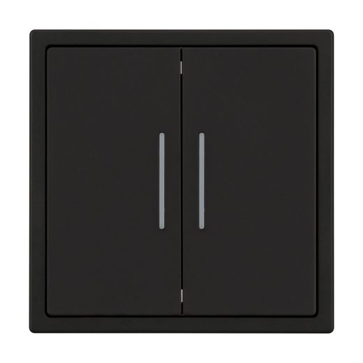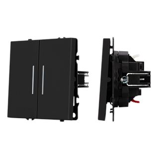 Механизм звонкового выключателя двухклавишный на 1 пост 2 самовозвратные клавиши. Цвет - черный оникс, с Soft-Touch покрытием. Клавиша имеют LED подсветку - cинего свечения. Без фронтальной рамки. Уровень пылевлагозащиты IP20. Выключатель устанавливается в стандартный круглый подрозетник круглого сечения диаметром 60мм.