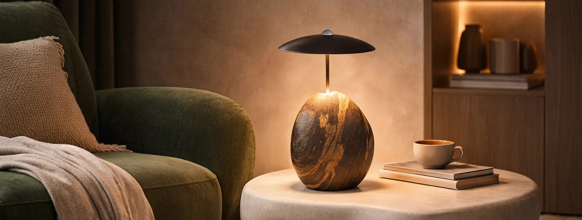 Каждый светильник изготовлен из натурального камня с неповторимой текстурой и расцветкой. Природа создала настоящий шедевр — а вы станете обладателем эксклюзивного предмета интерьера, который невозможно повторить.