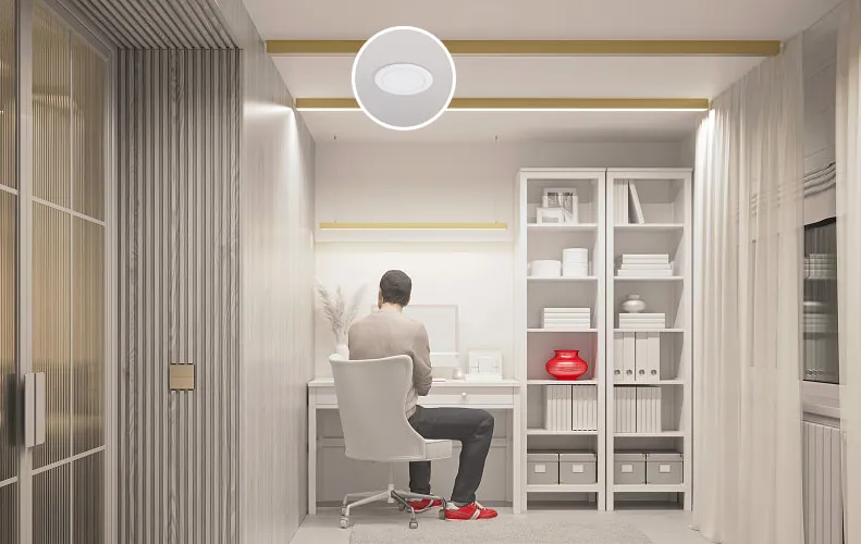 Датчик PRIME RP распознает присутствие, а не просто движение, благодаря детекции микродвижений (печать, дыхание). Свет останется включенным, пока вы за компьютером или в кресле.