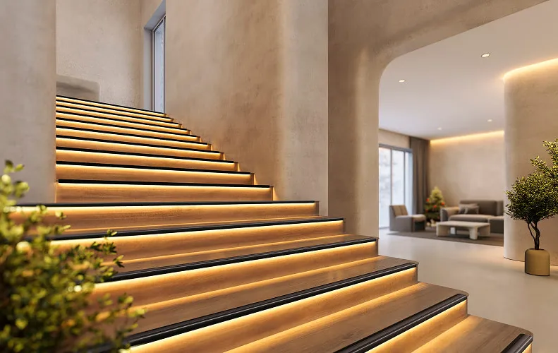 Конструкция профиля разработана так, что свечение направлено вниз. Это исключает ослепляющий эффект и создаёт комфортное для зрения освещение даже на максимальной яркости. Благодаря сочетанию практичности и аккуратности STAIR W60 становится незаменимым элементом лестничных конструкций в современных интерьерах.